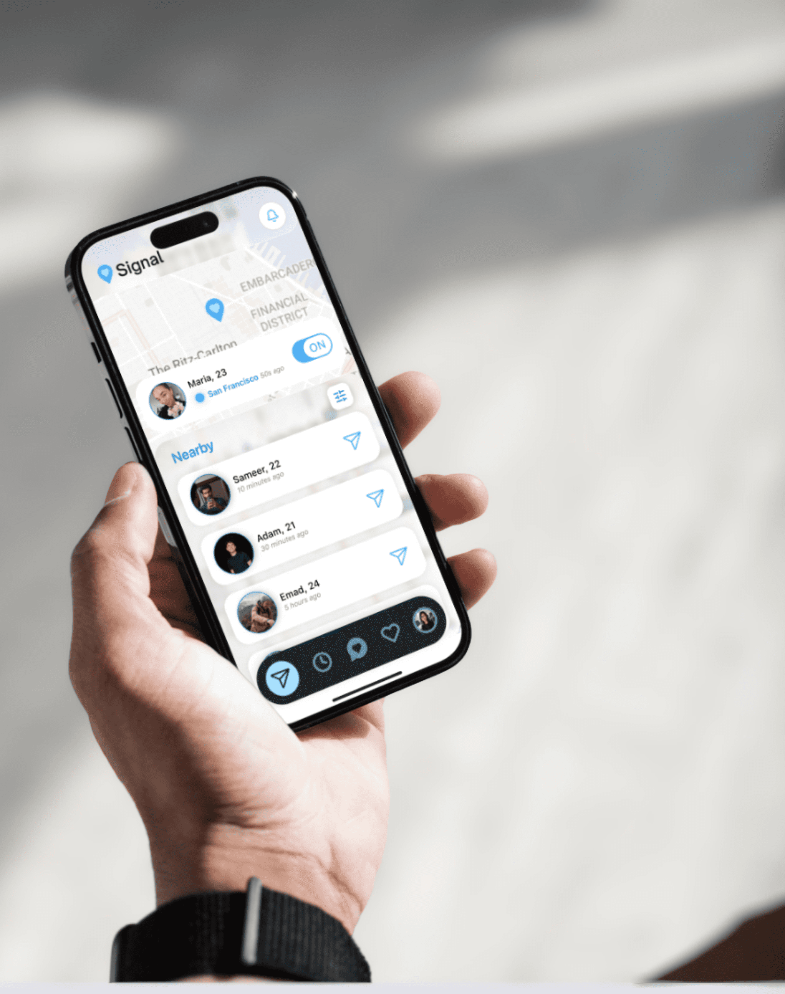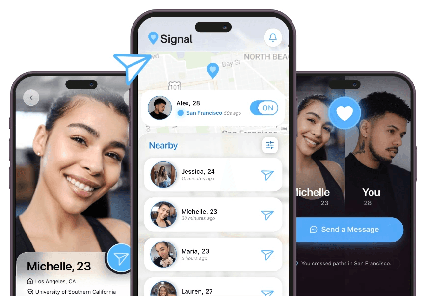 Anonymously signal people you were actually near — at a café, on campus, or walking down the street.